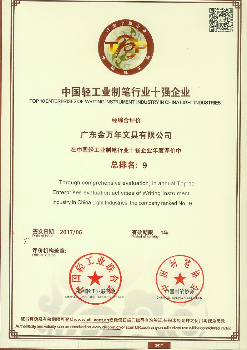 广东金万年文具有限公司荣获“中国轻工业制笔行业十强企业”称号!