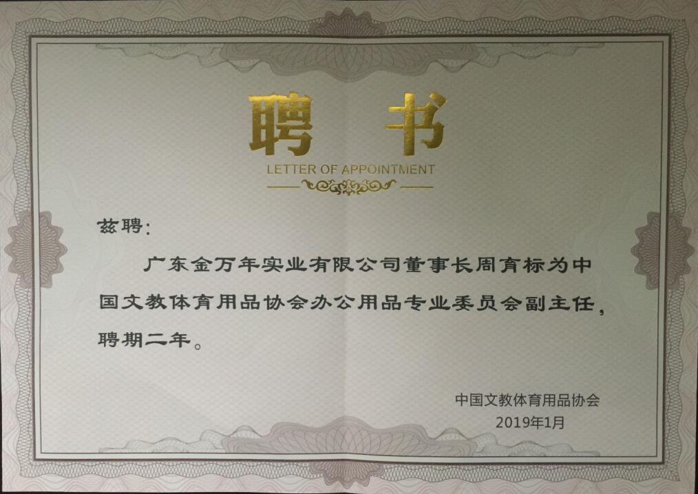 公司董事长周育标先生被聘请为中国文教体育用品协会办公用品专业委员会副主任