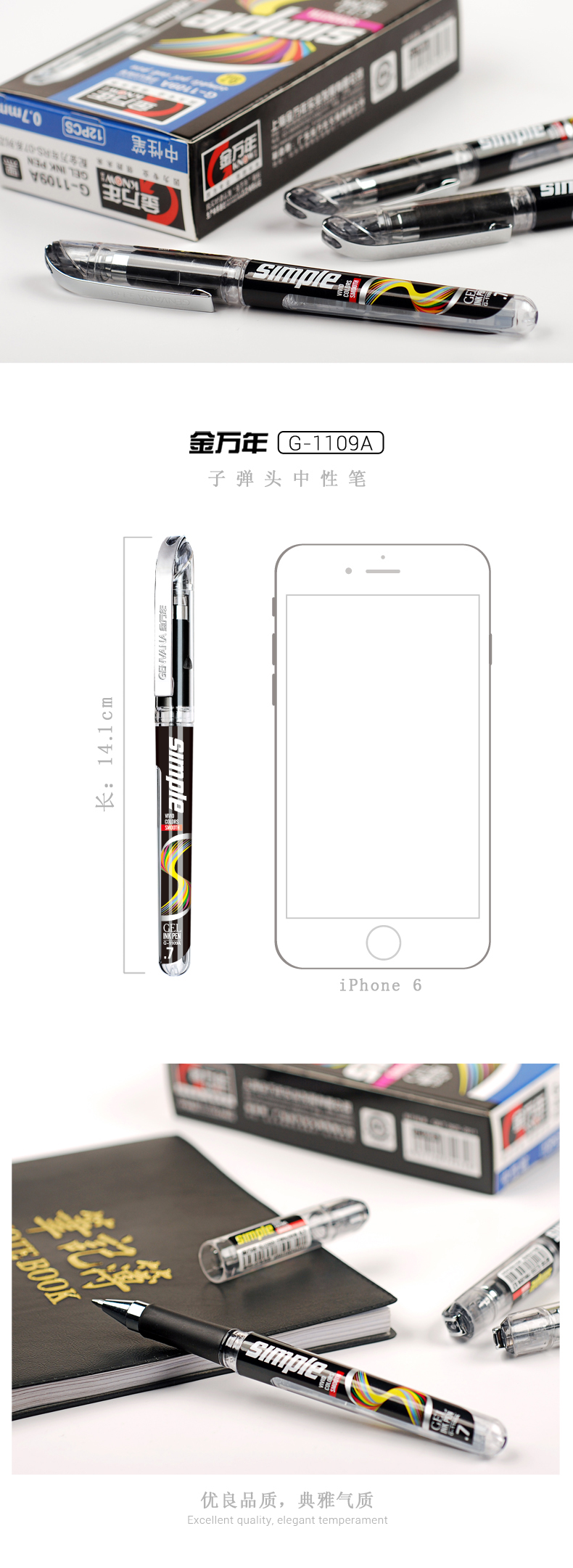 黑金0.7子弹头配RS14系列芯金色夹拔帽中性笔