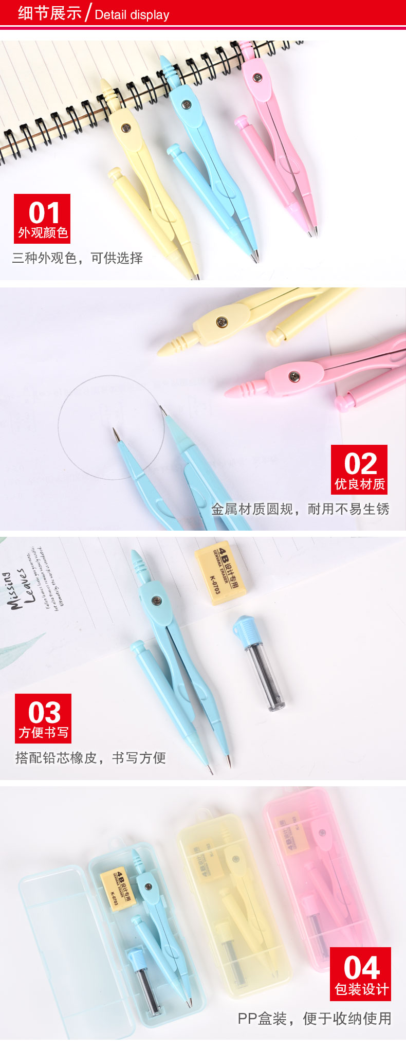 绘图圆规+橡皮+铅芯粉色系3件套插式盒装(G-6321)