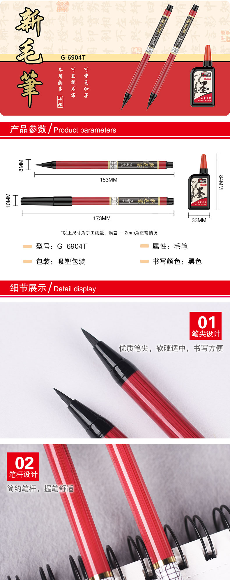 商品属性 产品参数: 颜色:黑色 书写幅度:小楷 外观颜色:红色