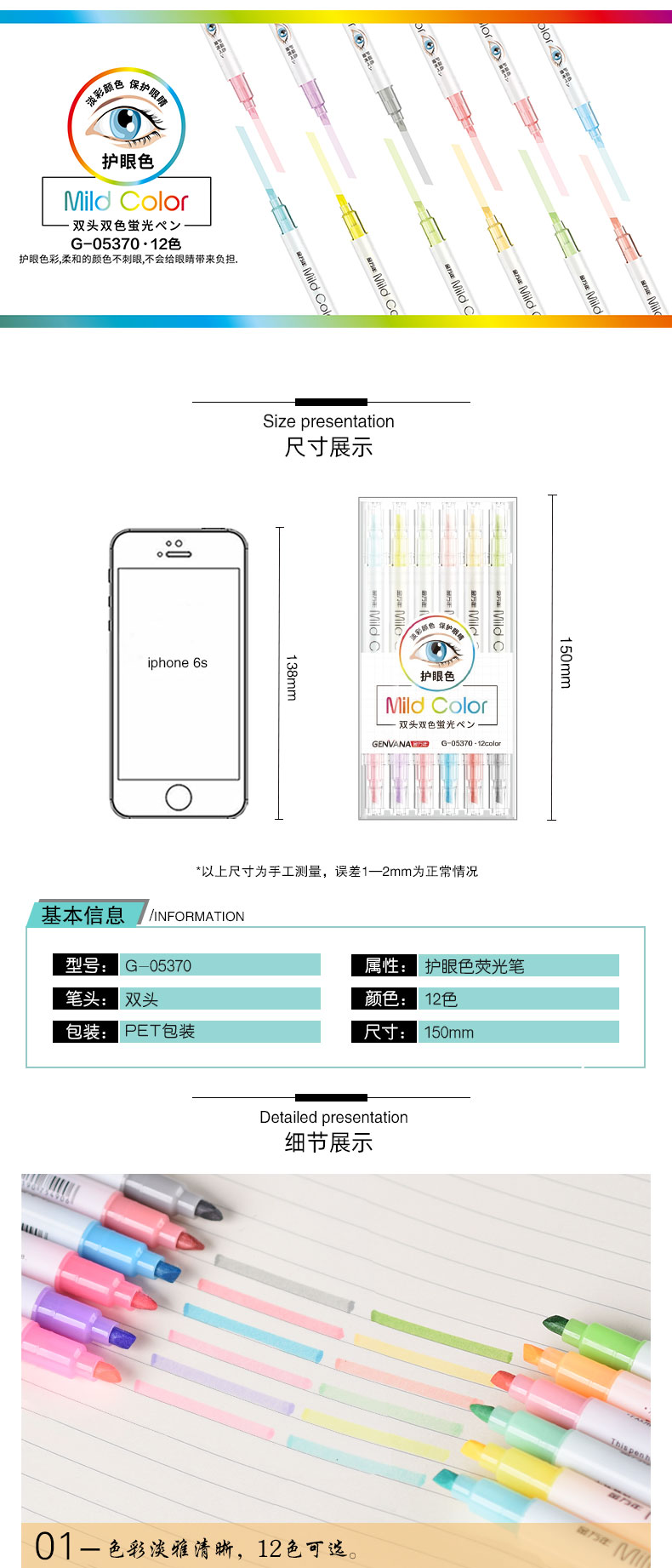 双头双色护眼色12色套装荧光笔(G-05370)